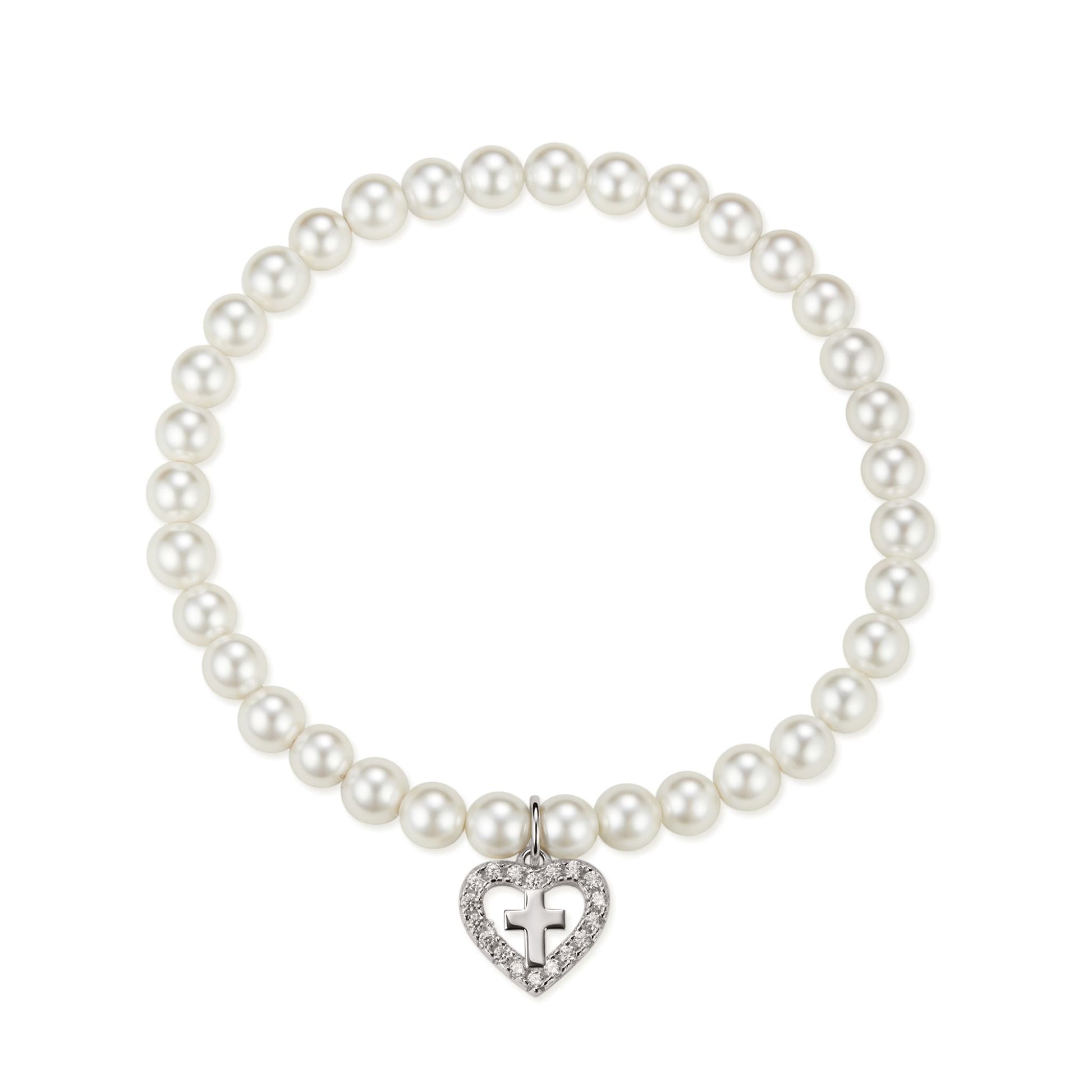A timeless keepsake to celebrate a very special day. This delicate First Communion bracelet features classic ivory pearls and a sparkling heart-shaped charm with a cross, symbolising faith, love, and devotion.